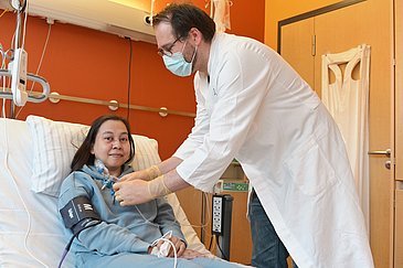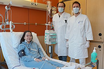 Ihre letzte Chance: eine CAR-T-Zell-Therapie. Erst im Januar 2026 hatte ein Team um Prof. Dr. Andreas Mackensen, Direktor der Medizinischen Klinik 5 – Hämatologie und Internistische Onkologie, und Prof. Dr. med. univ. Georg Schett, Direktor der Medizinischen Klinik 3 – Rheumatologie und Immunologie des Uniklinikums Erlangen, die Ergebnisse der CASTLE-Studie veröffentlicht – die bisher weltweit größte Publikation zur Wirksamkeit von CAR-T-Zellen bei Autoimmunerkrankungen. Im Rahmen dieser Studie erhielten 24 Patientinnen und Patienten, die unter systemischem Lupus erythematodes, systemischer Sklerose oder einer entzündlichen Muskelerkrankung litten, CAR-T-Zellen. Alle 24 wurden dadurch therapie- und krankheitsfrei und der Großteil blieb es auch noch ein Jahr nach der Behandlung. Nun wurde das Studienprotokoll erweitert. „Es soll jetzt untersucht werden, wie sich unterschiedliche Dosierungen der vorbereitenden Chemotherapie auf das Therapieansprechen auswirken“, erklärt Dr. Andreas Wirsching, Leiter der Studienambulanz der Medizin 3. Maulia F. wurde in die erweiterte CASTLE-Studie aufgenommen. „Ich bin froh, dass die Ärztinnen und Ärzte in Erlangen mir etwas anbieten können. Es ist eine Behandlung, die so neu ist, dass andere Kliniken da sehr zurückhaltend waren. Bei ihnen sollte ich einfach weiter die Standardtherapie bekommen“, sagt sie.