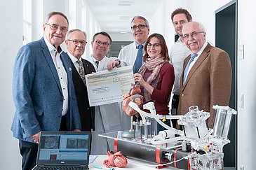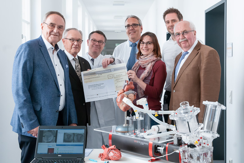 Warum halten manche Herzklappenprothesen länger als andere? Was ist der Grund dafür, dass plötzlich ein Segel einer biologischen Herzklappe ein- oder abreißt? Diese und weitere Fragen zur Qualität und Haltbarkeit von biologischen Herzklappen werden derzeit an der Herzchirurgischen Klinik (Direktor: Prof. Dr. Michael Weyand) des Universitätsklinikums Erlangen von einer interdisziplinären Biomechanik-Arbeitsgruppe um Dr. Nina Ebel und Dr. Markus Kondruweit in einem eigens entwickelten Versuchsstand mittels einer Hochgeschwindigkeitskamera erforscht. Mit einer großzügigen Spende unterstützt die Manfred-Roth-Stiftung das Projekt und die Forschungsstiftung Medizin am Uni-Klinikum Erlangen (Vorstandsvorsitzender: Prof. Dr. Werner G. Daniel) stockt die Summe im Rahmen des Matching-Funds-Programm noch weiter auf. "Ich finde es phänomenal, wie hier zum Wohle des Patienten geforscht wird und bin von den Fortschritten begeistert", sagte Dr. Wilhelm Polster, Vorstand der Manfred-Roth-Stiftung, bei der Vorstellung der Forschungsarbeiten anlässlich der Übergabe des Spendenschecks.