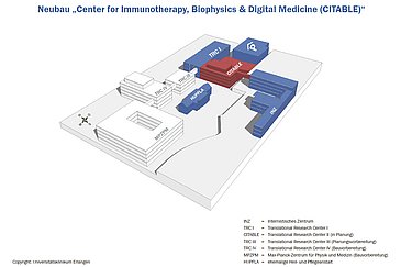 Die Gemeinsame Wissenschaftskonferenz von Bund und Ländern (GWK) hat jetzt ein Forschungsgebäude für rund 40 Millionen Euro in direkter Nachbarschaft zum Deutschen Zentrum Immuntherapie (DZI) am Universitätsklinikum Erlangen der Friedrich-Alexander-Universität Erlangen-Nürnberg (FAU Erlangen-Nürnberg) genehmigt. Das „Center for Immunotherapy, Biophysics & Digital Medicine (CITABLE)“ soll auf dem Nordgelände des Uni-Klinikums Erlangen zwischen Kopfkliniken und Internistischem Zentrum bis Ende 2025 vom Staatlichen Bauamt Erlangen-Nürnberg errichtet werden.
