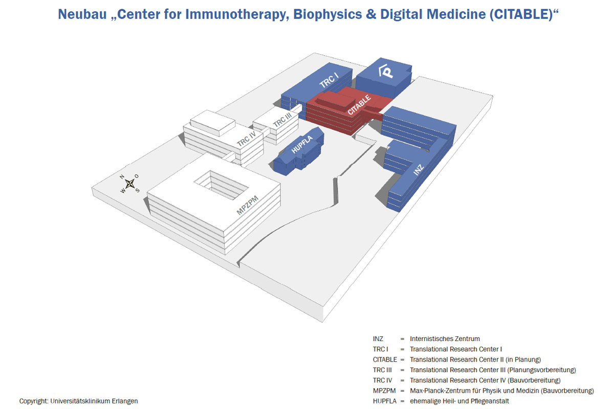 Die Gemeinsame Wissenschaftskonferenz von Bund und Ländern (GWK) hat jetzt ein Forschungsgebäude für rund 40 Millionen Euro in direkter Nachbarschaft zum Deutschen Zentrum Immuntherapie (DZI) am Universitätsklinikum Erlangen der Friedrich-Alexander-Universität Erlangen-Nürnberg (FAU Erlangen-Nürnberg) genehmigt. Das „Center for Immunotherapy, Biophysics & Digital Medicine (CITABLE)“ soll auf dem Nordgelände des Uni-Klinikums Erlangen zwischen Kopfkliniken und Internistischem Zentrum bis Ende 2025 vom Staatlichen Bauamt Erlangen-Nürnberg errichtet werden.