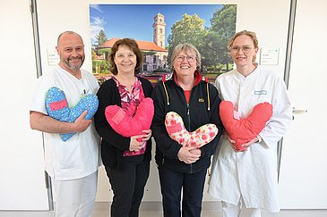 Auch Gurt- und Portkissen bringen die beiden Hobbynäherinnen regelmäßig mit. Sie dienen als Polster unter Sicherheits- oder Tragegurten sowie als Schutz des empfindlichen Bereichs um einen dauerhaften Venenzugang herum. „Unsere Kolleginnen und Kollegen im neuen Interdisziplinären Tumortherapiecentrum im UImenweg haben die kleinen Port- und Gurtkissen auch schon für die dortigen Krebspatientinnen und -patienten angefordert. Die hilfreichen Kissen sind jetzt also auch außerhalb der Frauenklinik im Einsatz. Es ist toll, dass Sie uns mit Ihrer ehrenamtlichen Arbeit so regelmäßig unterstützen“, sagte Ärztin Dr. Sophie Eckstein, die die Spende gemeinsam mit Physiotherapeut Mario Witter entgegennahm. Die Säcke voller Kissen werden in der Frauenklinik im Bereich der Krankengymnastik gelagert. „Lange behalten werden wir sie allerdings nicht – bei den vielen Patientinnen, die wir ständig damit versorgen“, erklärte Mario Witter.