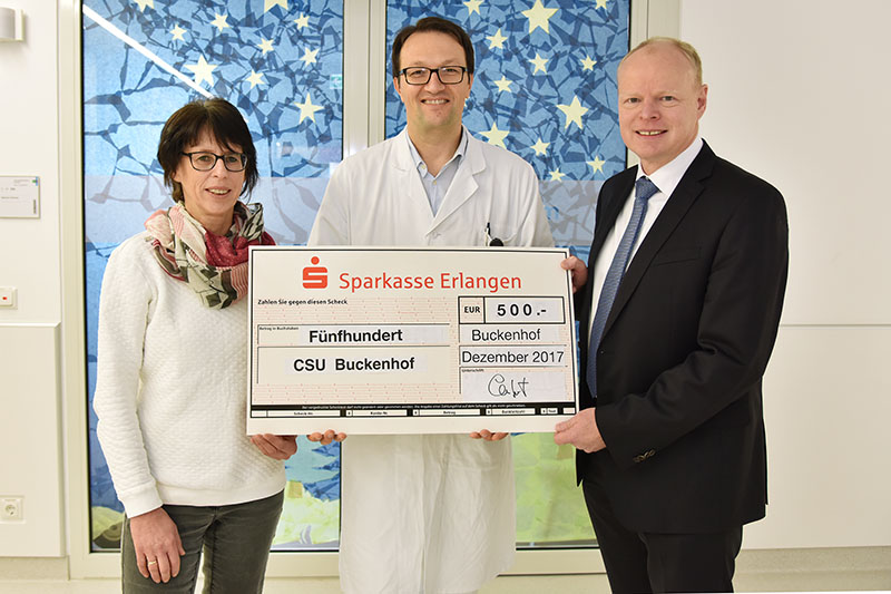 Die Mitglieder des CSU-Ortsverbandes Buckenhof, vertreten durch den Vorsitzenden Kai Lenfert und die stellvertretende Vorsitzende Sigrid von Poblocki, haben 500 Euro an die Kinderonkologie der Kinder- und Jugendklinik (Direktor: Prof. Dr. Dr. h. c. Wolfgang Rascher) des Universitätsklinikums Erlangen gespendet. Die Summe kam beim alljährlichen Adventssingen des CSU-Ortsverbandes in Buckenhof zusammen. Prof. Dr. Markus Metzler, Leiter der Kinderonkologie, bedankte sich im Namen seiner Patienten persönlich bei den Spendern.