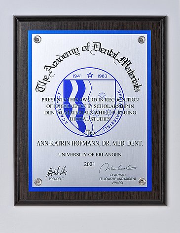 Die Zahnklinik 1 verlieh im Namen der Fachgesellschaft „Academy of Dental Materials“ den University Student Award 2021 an Fr. Dr. med. dent. Ann-Katrin Hofmann für ihre Dissertation mit dem Titel