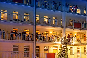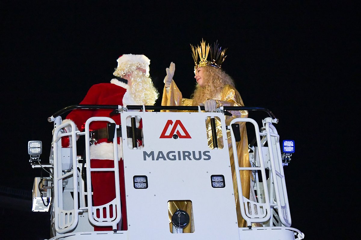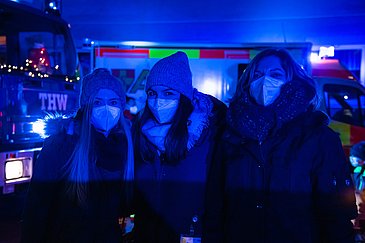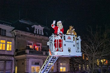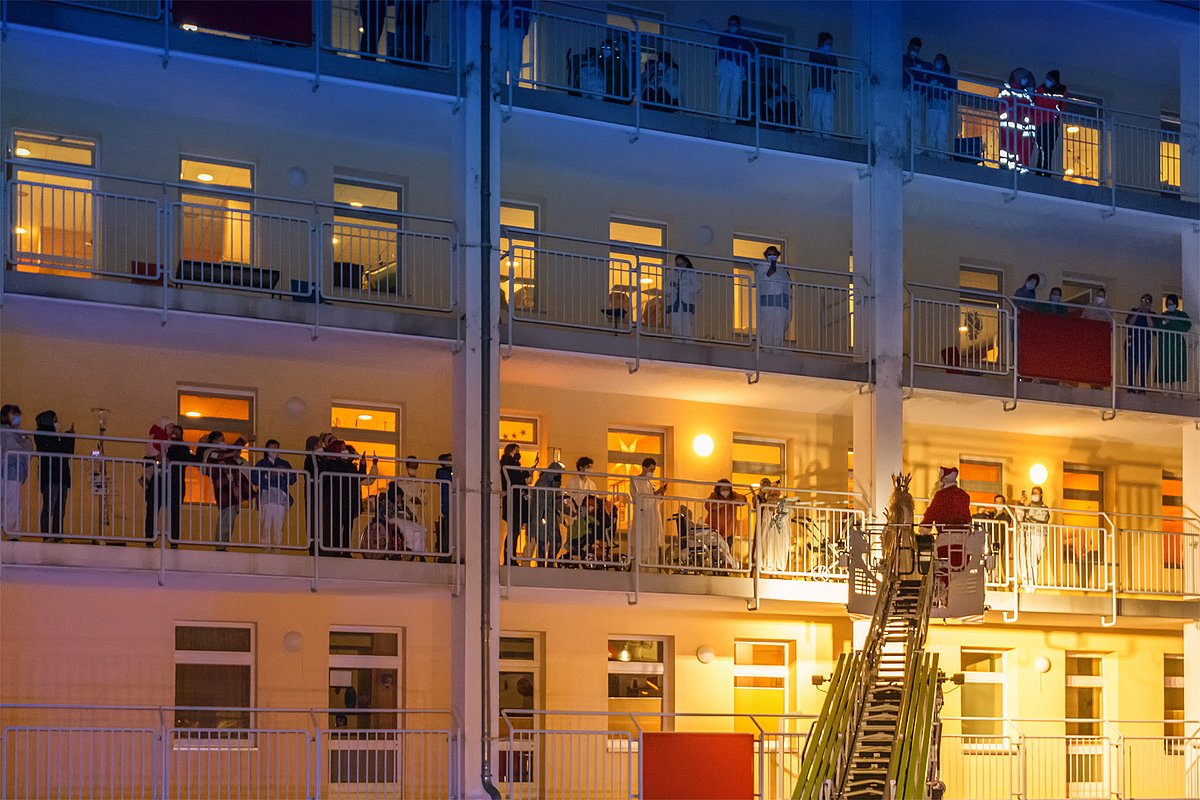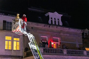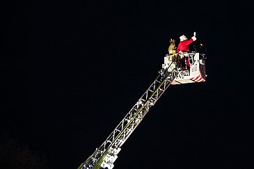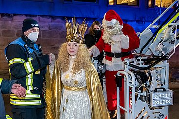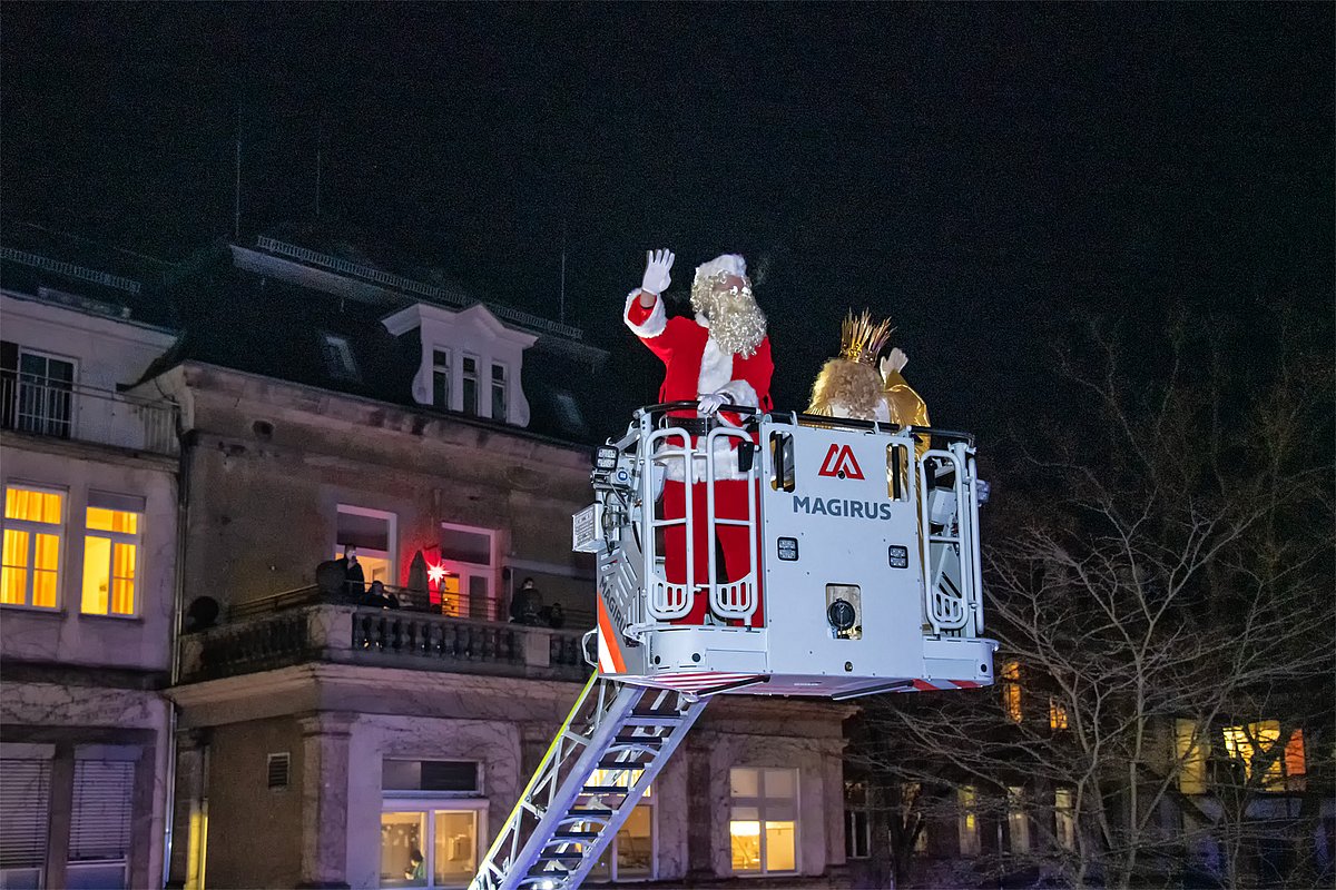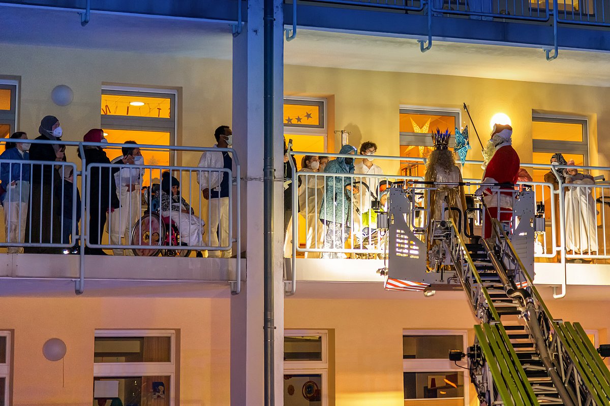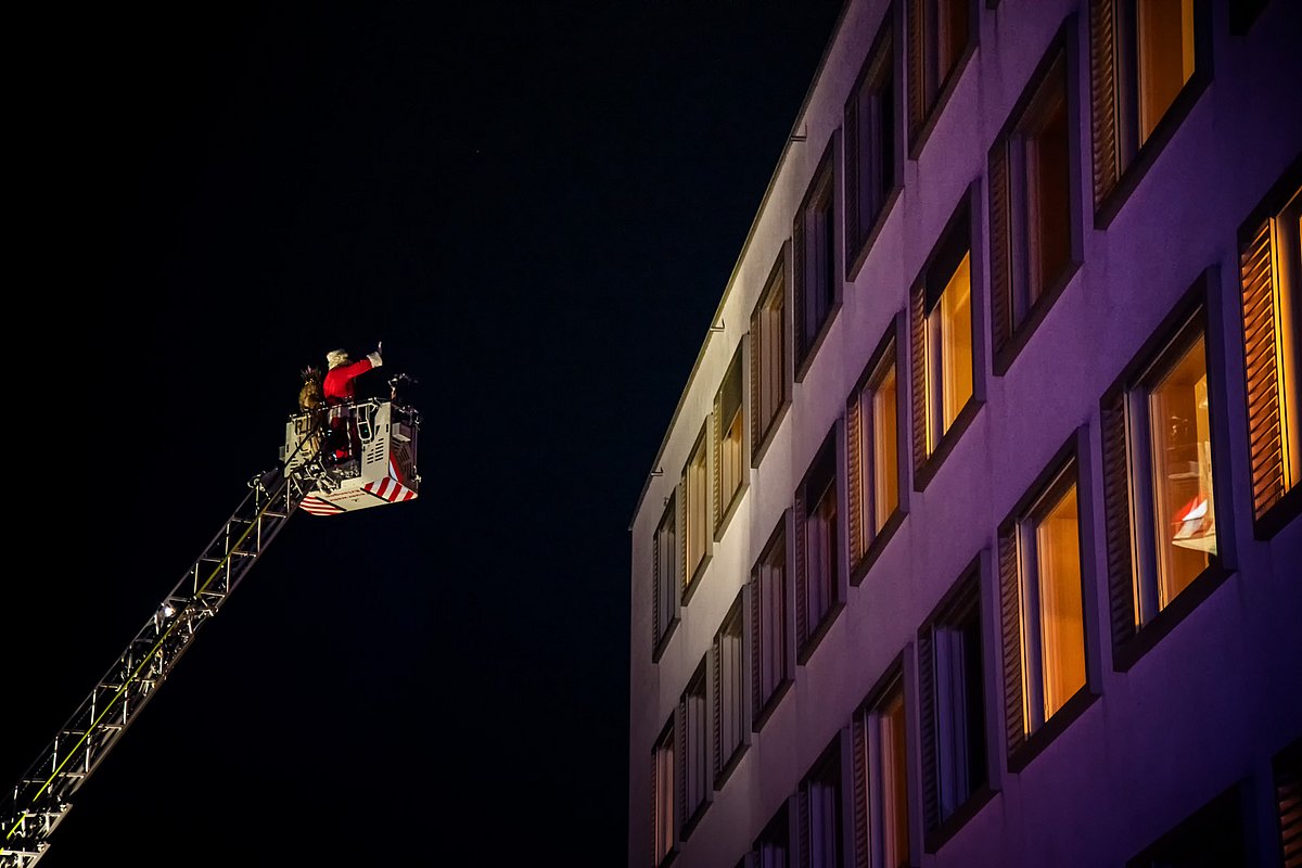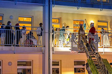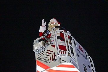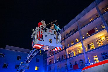 Begleitet vom blinkenden Blaulicht der Einsatzfahrzeuge und Weihnachtsliedern aus Lautsprechern schwebten das Nürnberger Christkind und der Weihnachtsmann mithilfe der Feuerwehrdrehleiter in luftiger Höhe. Von dort aus winkten sie den staunenden Kindern und Jugendlichen, deren Eltern und allen anderen begeisterten Schaulustigen auf den Balkonen und an den Fenstern der Klinikgebäude zu und überbrachten gute Wünsche für die anstehenden Feiertage.