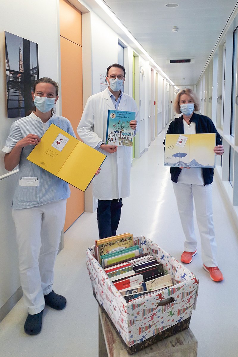 Von den Spenden wurden in einem lokalen Buchladen 40 Schmöker für die Kinderonkologie der Kinder- und Jugendklinik (Direktor: Prof. Dr. Joachim Wölfle) des Universitätsklinikums Erlangen erstanden und jetzt an den Leiter Prof. Dr. Markus Metzler überreicht.