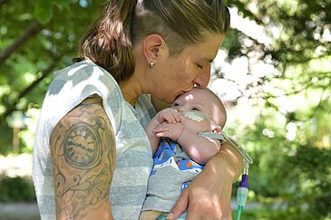 Kaum auf der Welt, nahm sich ein Oberarzt der Kinderherzchirurgischen Abteilung (Leiter: Prof. Dr. Oliver Dewald) Felix’ Bluterguss im Herzen an, beseitigte Gerinnsel und zähflüssiges Blut und nahm so den Druck vom Herzen des Säuglings. Mit nur 1.410 Gramm Körpergewicht und einer Größe von 36 Zentimetern wurde Felix auf die Intensivstation gebracht, künstlich beatmet und an Drainageschläuche angeschlossen, die weiterhin die Flüssigkeit aus seinem Körper schleusten. „Ich habe ihn nach der Entbindung kurz gestreichelt und ihn dann im Inkubator liegen sehen. Herausnehmen durfte ich ihn erst drei Wochen später“, erinnert sich Nadine Steinlein. Erst dann konnte sie endlich mit Felix „känguruhen“: ihn sich zum Kuscheln auf ihren Oberkörper legen, Herz an Herz. „Es war ergreifend und voller Liebe, machte mir aber auch Angst“, gesteht die 36-Jährige. „Angst, die Verbindung, die wir schon hatten, zu stärken, und dabei zu wissen, dass alles auch nicht gut ausgehen könnte.“