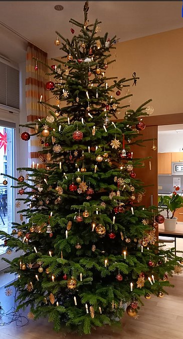 Seit vielen Jahren schon unterstützt der Förderverein der Palliativmedizin am Universitätsklinik Erlangen e.V. die Anschaffung des fast drei Meter hohen Weihnachtsbaums, der zur Weihnachtszeit im Wohnzimmer der Palliativstation steht. Mitarbeiterinnen und Mitarbeiter der Palliativmedizinischen Abteilung schmücken den Baum liebevoll in ihrer Freizeit und werden oft von Patientinnen und Patienten oder deren Angehörige freundlich dabei unterstützt.