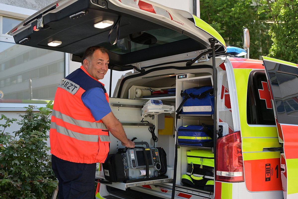 In den Anfängen des Erlanger Notarztdienstes kamen oft noch klobige Alukoffer und mitunter auch Sporttaschen für Equipment und Medikamente zum Einsatz. Heute sind die NEFs mit Hightech-Notfallrucksäcken, modernen EKG- und Reanimationsgeräten sowie mit Videolaryngoskopen ausgestattet, die eine schnelle und sichere Atemwegssicherung und Beatmung ermöglichen. „Das Uniklinikum Erlangen war schon immer Vorreiter bei technischen Neuerungen in der präklinischen Notfallmedizin“, sagt Albert Schiele. „Bereits lange vor einer bayernweiten Einführung der Kapnometrie – also einer Messung des CO2-Gehalts in der Ausatemluft zur Verifizierung der Lage des Beatmungsschlauchs – und vor der Einführung mechanischer Reanimationsgeräte oder der Videolaryngoskopie wurden diese Geräte dank des persönlichen Engagements unseres früheren Klinikdirektors Prof. Schüttler durch das Uniklinikum beschafft und kamen in der Notfallmedizin zum Einsatz“, erläutert Dr. Schiele. „Heute sind die Fahrzeuge und die medizinische Ausrüstung bayernweit standardisiert und technisch auf einem sehr hohen Niveau.“