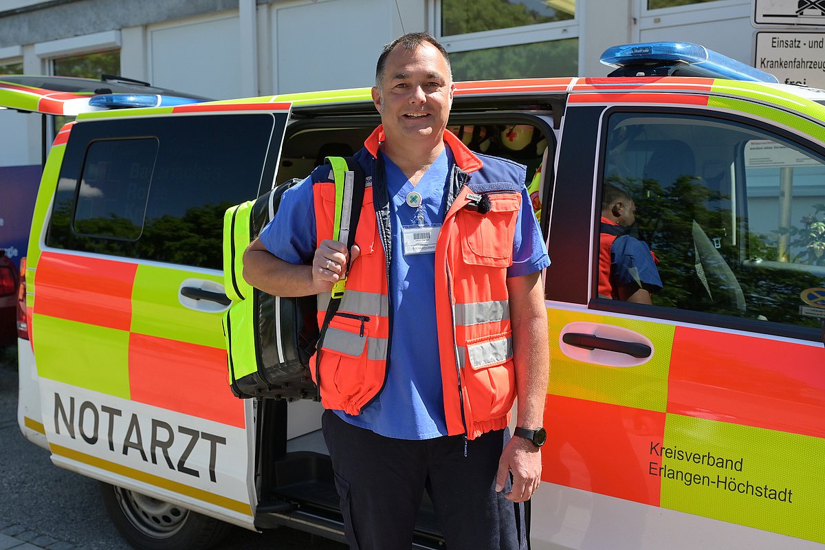 Fast 30 Jahre lang fuhren Notärztin bzw. -arzt und Rettungswagenbesatzung zusammen vom Uniklinikum zum Einsatzort. Von der chirurgischen Pforte aus wurden sie im Haus per Piepser alarmiert. Im Oktober 2003 änderte sich dieses Kompakt-System und das sogenannte Rendezvous-System begann: Seitdem bringt ein Notarzteinsatzfahrzeug (NEF) in Form eines Pkws oder Vans den Arzt zur Einsatzstelle; der Rettungswagen fährt separat. „Vor allem, wenn mehrere Notfälle gleichzeitig passierten, stieß das frühere Kompakt-System an seine Grenzen“, erklärt Dr. Albert Schiele, Oberarzt der Anästhesiologie des Uniklinikums Erlangen und dort verantwortlich für den Notarztdienst. „Heute ist das Uniklinikum Erlangen am Betrieb von drei Notarzteinsatzfahrzeugen beteiligt. Ein NEF ist dauerhaft bei uns stationiert, die anderen zwei stehen in Höchstadt und Herzogenaurach. Diese Notarztzubringer machen uns wesentlich schneller und flexibler. Wird ein Notarzt zum Beispiel nach der medizinischen Versorgung nicht zwingend im Rettungswagen gebraucht, kann er dank NEF direkt weiter zum nächsten Auftrag. In den vergangenen 20 Jahren kam es kein einziges Mal vor, dass wir ein NEF nicht ärztlich besetzen konnten“, betont Dr. Schiele. Neben dem BRK stellt seit 20 Jahren auch die Notfallhilfe gGmbH des Arbeiter-Samariter-Bundes vom Regionalverband Erlangen-Höchstadt nichtärztliches NEF-Personal. Koordiniert werden alle Einsätze von der Integrierten Leitstelle in Nürnberg.