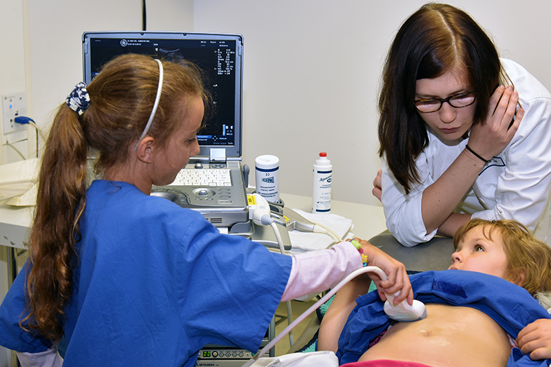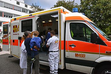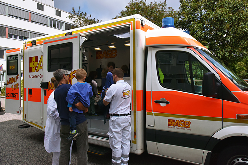 Nachdem alle Gummibärchen und die Simulationspuppe gerettet waren, ging es zur nächsten Station: Wer wollte, konnte sich den Arm eingipsen lassen - was alle Kinder mit Begeisterung und Stolz auch taten. Außerdem durften die Mädchen und Jungen an einem Ultraschallgerät üben, innere Organe wie Leber und Nieren zu finden. Ein echter Rettungswagen stand auf dem Maximiliansplatz auch noch zur Besichtigung bereit. Die Sanitäter und Rettungsassistenten erklärten, wo Mama sitzt, wenn ein Kind mit dem Rettungswagen transportiert werden muss, zeigten, mit welchem Knöpfchen das Blaulicht angeht und schauten dabei in aufmerksame Kinderaugen. Nach einer Stärkung mit Brezn und Getränken ging es abschließend in den Schockraum, wo Dr. Besendörfer vorführte, wie Schwerverletzte versorgt werden.