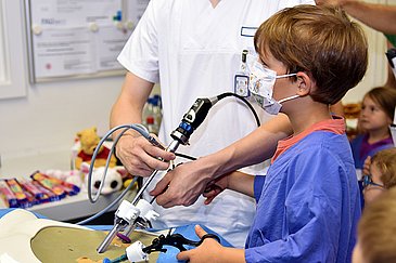 "Ach du Schreck! Da ist ja eine Tüte Gummibärchen im Bauch!", sagt Assistenzarzt Sigurd Seitz erschrocken. Vermutlich war die Simulationspuppe etwas zu gierig und hat die Packung mit der süßen Leckerei samt Plastiktütchen verschluckt. Zum Glück sind 24 kleine Helfer sofort zur Stelle und versuchen, durch einen minimalinvasiven Eingriff das Leben der Simulationspuppe zu retten. Die "Bauchoperation" war nur eine von vielen Aktionen, die die zweieinhalb bis sechs Jahre alten Mädchen und Jungen erleben konnten. Sie alle gehen in den Erna-Zink-Kindergarten und waren zu Besuch in der Kinderchirurgischen Abteilung (Kommissarischer Leiter: Prof. Dr. Robert Grützmann) des Universitätsklinikums Erlangen.