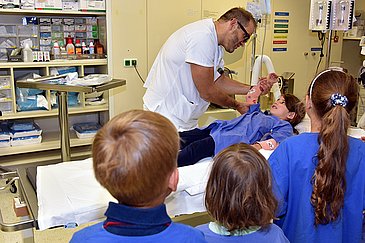 Bereits zum dritten Mal besuchte eine Kindergartengruppe die Kinderchirurgie. "Wir zeigen den Kindern spielerisch, was alles in einem Krankenhaus passiert - zum Beispiel, wie ein Krankenwagen von innen aussieht oder dass es nicht wehtut, wenn man einen Gips bekommt", erklärt der leitende Kinderchirurg Dr. Manuel Besendörfer, der die Kinder gemeinsam mit drei Assistenzärzten, einem angehenden Mediziner im praktischen Jahr und einer Gesundheits- und Krankenpflegerin durch den Tag begleitete. "Idealerweise können wir ihnen dadurch mögliche Ängste nehmen und sie wissen im Ernstfall - der hoffentlich nie eintritt - was auf sie zukommt."