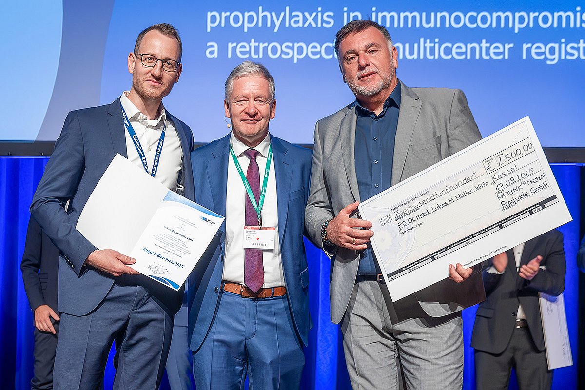 Im Rahmen des Jahreskongresses der Deutschen Gesellschaft für Anästhesiologie und Intensivmedizin e. V. (DGAI) wurde PD Dr. Lukas Müller-Wirtz, Facharzt in der Anästhesiologischen Klinik (Direktor: Prof. Dr. Roland C. E. Francis) des Uniklinikums Erlangen, der August-Bier-Preis 2025 verliehen. Der von der Firma Pajunk Medical Produkte GmbH gestiftete und mit 2.500 Euro dotierte Preis würdigt Arbeiten auf dem Gebiet der klinischen Regionalanästhesie. DGAI- und Kongresspräsident Prof. Dr. Gernot Marx betonte während der Preisverleihung die Bedeutung solcher wissenschaftlichen Auszeichnungen: „Die Vergabe der wissenschaftlichen Preise im Rahmen unseres Jahreskongresses würdigt herausragende Leistungen und Innovationskraft. Sie motiviert die gesamte Fachwelt, neue Erkenntnisse zu gewinnen und die Patientenversorgung kontinuierlich zu verbessern.“