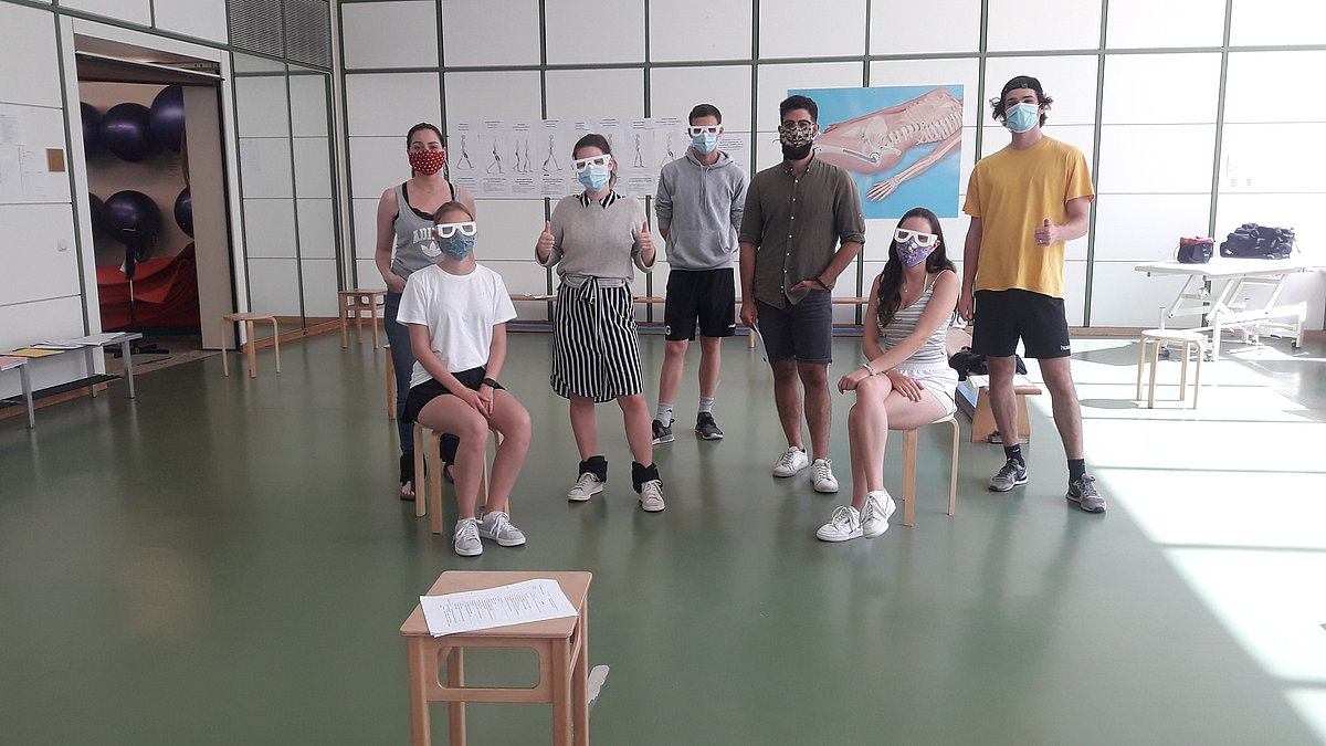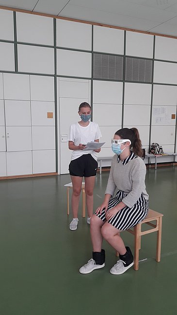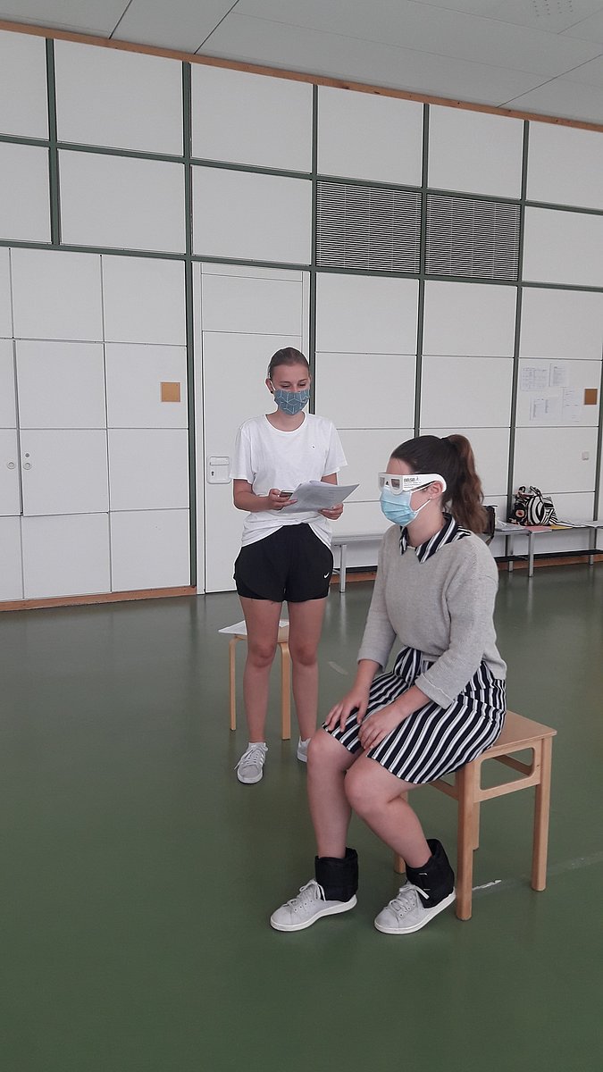 Durch Gewichte an den Extremitäten und angefertigte Blindenbrillen wird eine lebenserschwerende Situation dargestellt.