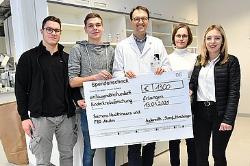 13 angehende Elektronikerinnen und Elektroniker für Geräte und Systeme der Siemens AG sowie von Siemens Healthineers wollten etwas Gutes zurückgeben, nachdem ihnen ihre Ausbilder Rainer Morgenroth und Matthias Kupfer in ihrer Freizeit einen Vorbereitungskurs für die Abschlussprüfungen ermöglicht hatten. Insgesamt 1.300 Euro legten die Auszubildenden zusammen. Den Spendenscheck übergaben nun Johanna Stengl, Pascal Audenrith und Steffen Mirsberger an Prof. Dr. Markus Metzler, Leiter der Kinderonkologie der Kinder- und Jugendklinik (Direktor: Prof. Dr. Joachim Wölfle) des Universitätsklinikums Erlangen. Das Geld kommt der Krebsforschung im Bereich molekulare Diagnostik zugute.