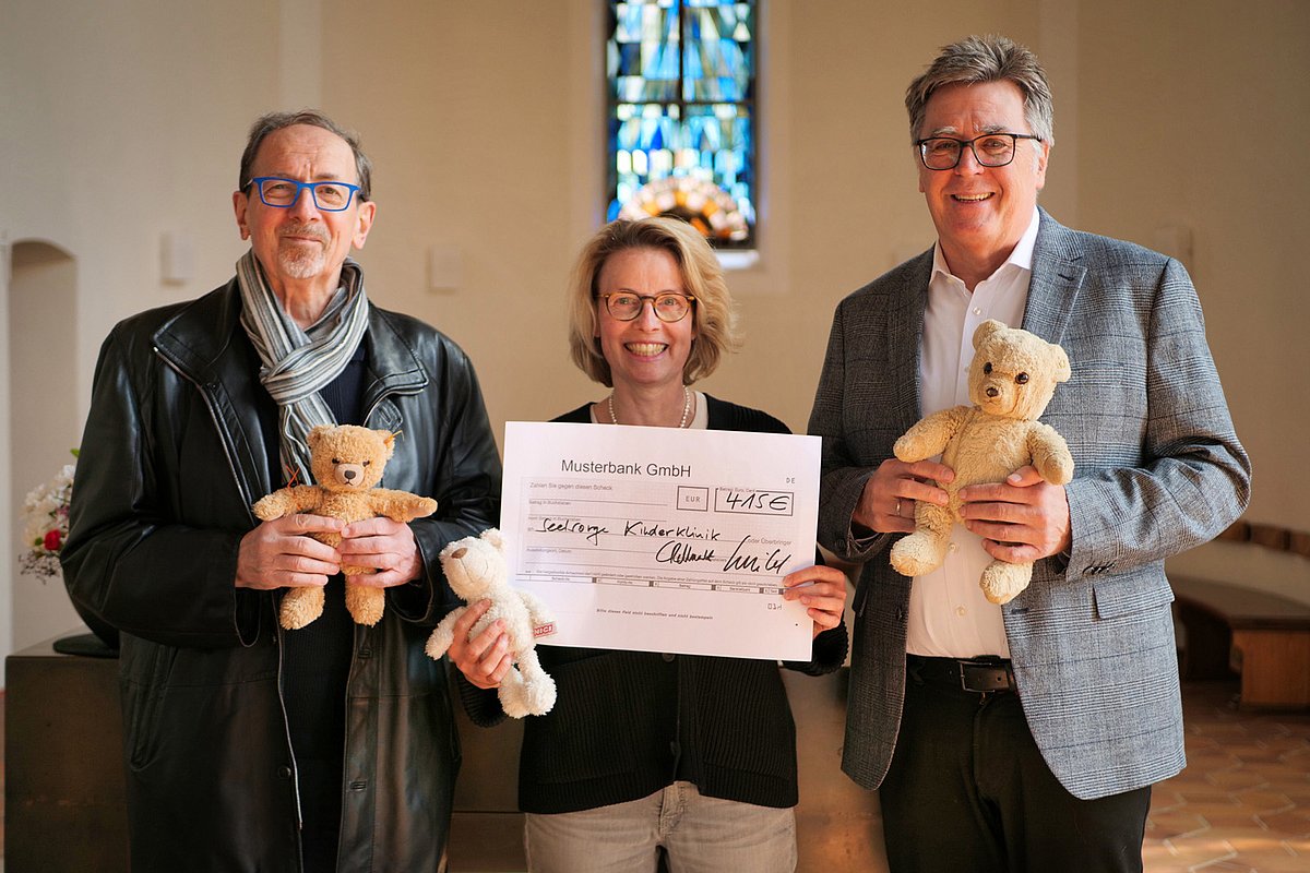 „Teddybären? Kinderkram!“ – hörte Hans Jürgen Luibl mehrmals, als er seine Idee vorstellte. Doch er ist überzeugt – die Plüschtiere sind mehr als das: „Teddybären trösten, wenn das Leben an Grenzen kommt. Sie begleiten uns oft unser ganzes Leben lang“, sagt er. Und tatsächlich: Zum Teddybärengottesdienst brachten Jung und Alt ihre kuschligen Begleiter mit – viele davon mehrere Jahrzehnte alt. Und weil gerade in dunklen Zeiten kleine Trostspender viel bewirken können, ging die Kollekte des Gottesdienstes an die Klinikseelsorge der Kinderklinik des Uniklinikums Erlangen. 415 Euro kamen zusammen und sollen nun eingesetzt werden, um weitere Trostspender für die jungen Patientinnen und Patienten anzuschaffen. Kathrin Kaffenberger, evangelische Pfarrerin und Klinikseelsorgerin, bedankte sich herzlich: „Teddys schenken unseren Patientinnen und Patienten Trost und Geborgenheit in beängstigenden Situationen. Deshalb habe ich als Klinikseelsorgerin immer einige Teddys und andere Kuscheltiere im Büro, die ich – je nach Situation und Alter des Kindes – mitbringe. Umso schöner, dass wir dank der Spende weitere Trösterle besorgen können.“