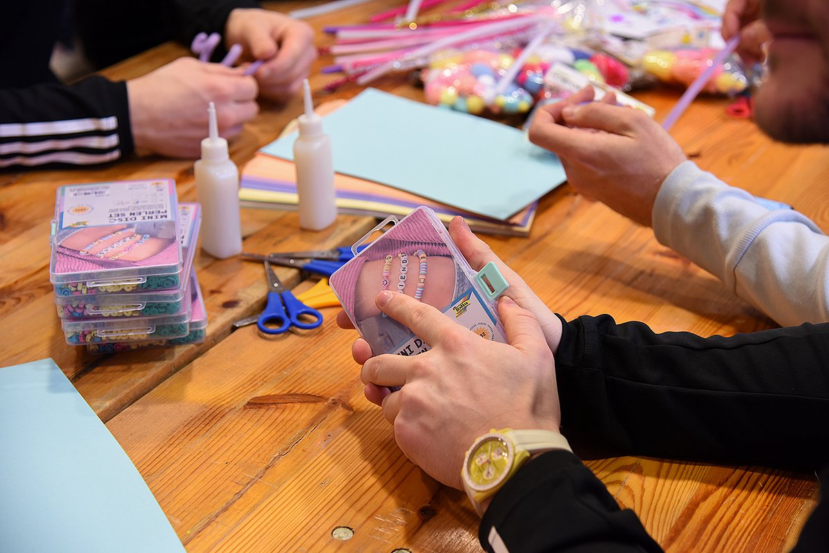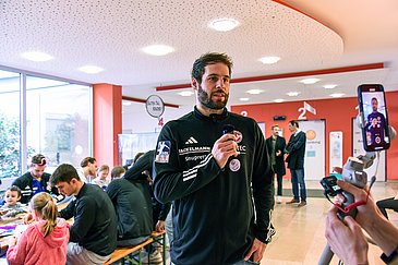 Zunächst ging es an eine Button-Maschine, an der sich alle HC-Erlangen-Spieler und die Kinder einen mit ihrem Namen beschrifteten Anstecker fertigten. Danach startete die Bastelaktion an einem großen Tisch, den das Team der Erzieherinnen um Marion Müller im Foyer der Kinderklinik aufgebaut hatten. Neben Scheren, verschiedenen Stiften und buntem Fotokarton brachten die Handballer beispielsweise auch kleine Buchstaben-Perlen mit, die auf Schnüre gefädelt werden konnten. Rückraumspieler Lutz Heiny, der seit 2019 beim HC Erlangen unter Vertrag ist, bastelte sich als erstes einen rosa Kopfschmuck aus Pfeifenreinigern und brachte damit seine Mannschaftskameraden und die mitbastelnden Kinder gleichermaßen zum Lachen. Nico Büdel, der im Team ebenfalls im Rückraum agiert, kam bereits mehrfach in die Kinderklinik, um gemeinsam mit den jungen Patientinnen und Patienten zu basteln und ihnen so etwas Abwechslung vom Klinikalltag zu verschaffen: „Das ist für uns ein besonderer und spezieller Termin. Es ist schön, wenn man den Kindern ein Lächeln auf die Lippen zaubern kann und auch ein bisschen erfährt, was sie gerade beschäftigt.“ Zusammen mit seinen Teamkollegen besuchte Nico Büdel anschließend zusätzlich verschiedene Stationen der Kinderklinik, um auch die Patientinnen und Patienten, die weniger mobil sind, an der Aktion teilhaben zu lassen. Jedes Kind bekam einen handsignierten kleinen HC-Knautschball und Autogramme der Spieler.
