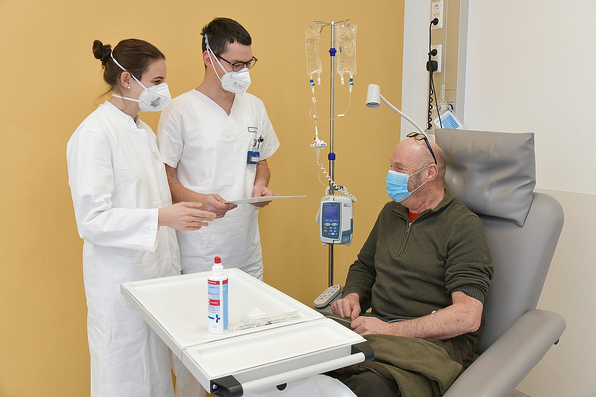 Um die optimale Versorgung der Patienten – besonders derjenigen mit lokal fortgeschrittenen Kopf-Hals-Tumoren – sicherzustellen, ist täglich ein Team aus HNO-Experten (Oberärztliches Team: PD Dr. Antoniu Gostian, PD Dr. Konstantinos Mantsopoulos, PD Dr. Sarina Müller, PD Dr. Maximilian Traxdorf) in der IOT in der Strahlenklinik (Oberärztliches Team: PD Dr. Marlen Haderlein, PD Dr. Markus Hecht, Dr. Sebastian Lettmaier, PD Dr. Sabine Semrau) vor Ort. Das interdisziplinäre Team zeichnet sich unter anderem dadurch aus, dass alle Ärzte im Bereich der medikamentösen Tumortherapie speziell geschult sind. In der IOT werden neben Immuntherapien, wie sie etwa Glyn Roberts per Infusion erhält, auch Chemotherapien und zielgerichtete Therapien, z. B. monoklonale Antikörper, angeboten. „In der IOT arbeiten Spezialisten aus den drei Säulen der Kopf-Hals-Onkologie – also Chirurgie, Strahlen- und Systemtherapie – zusammen und bieten Patienten individuell auf sie zugeschnittene Behandlungskonzepte auf immer aktuellem Stand“, erklärt der Direktor der HNO-Klinik Prof. Dr. Dr. h. c. Heinrich Iro.