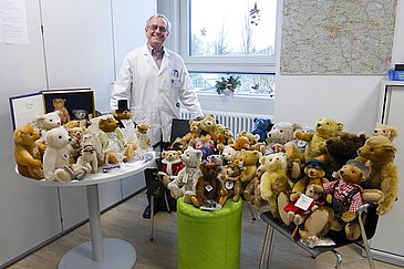 Von Bären umzingelt: Prof. Rascher mit allen Steiff-Teddybären, die in der Online-Auktion versteigert werden. (Bild: Michelle Dotzauer/Uni-Klinikum Erlangen)