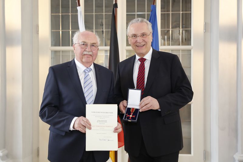 „Das Wohl des Patienten stand stets im Vordergrund Ihres Wirkens“, betonte Joachim Herrmann in seiner Laudatio für Prof. Dr. Werner Daniel. „Seit vielen Jahrzehnten setzen Sie sich selbstlos und nachhaltig für die medizinische Forschung und Gesundheitsfürsorge der Bevölkerung ein und haben sich damit in herausragendem Maße um unsere Gesellschaft verdient gemacht.“ Deshalb verlieh der Bayerische Staatsminister des Innern, für Sport und Integration dem emeritierten Direktor der Medizinischen Klinik 2 – Kardiologie und Angiologie nun im Namen des Bundespräsidenten das Verdienstkreuz am Bande des Verdienstordens der Bundesrepublik Deutschland. „Für mich ist diese Auszeichnung natürlich eine große Ehre und Freude zugleich“, sagte Prof. Daniel, der auch in seinem Ruhestand noch als Vorstandsvorsitzender der Forschungsstiftung Medizin am Uni-Klinikum Erlangen tätig ist, nach der Übergabe.