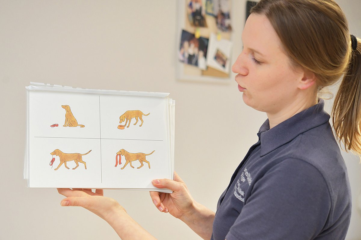 Klagen Patientinnen oder Patienten über länger anhaltende Heiserkeit, z. B. nach einer Überbelastung, einem Infekt oder einer Schilddrüsenoperation, hilft vielen von ihnen die „LAX VOX“-Therapie (lat. für „freie Stimme“) – das „Blubbern“. Irene Weiß erklärt das Vorgehen: „Die Betroffenen blasen mit einem kleinen Silikonschlauch in ein Gefäß mit Wasser, bis es blubbert. Die Vibrationen stimulieren den Kehlkopf und entspannen die Muskulatur.“ Bei Kindern verwendet die Logopädin am liebsten den Sprachverständnistest. Dabei sehen sie vier Bilder und müssen entscheiden, welches zum gesuchten Wort oder Satz passt, z. B. „Hase“ oder „Der Hund trägt den Schuh“. „Es gefällt mir sehr, mit Kindern zu arbeiten und ihnen die Freude am Sprechen beizubringen“, sagt Irene Weiß, die vorher ausschließlich in der Erwachsenentherapie tätig war. „Hier am Uniklinikum finde ich besonders gut, dass wir interdisziplinär zusammenarbeiten. Wenn wir in der Fachabteilung nicht wissen, warum es mit der Sprache nicht klappt, können wir die Kinder beispielsweise ans Sozialpädiatrische Zentrum weiterleiten, wo auch andere Entwicklungsbereiche untersucht werden.“