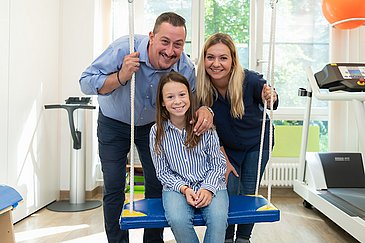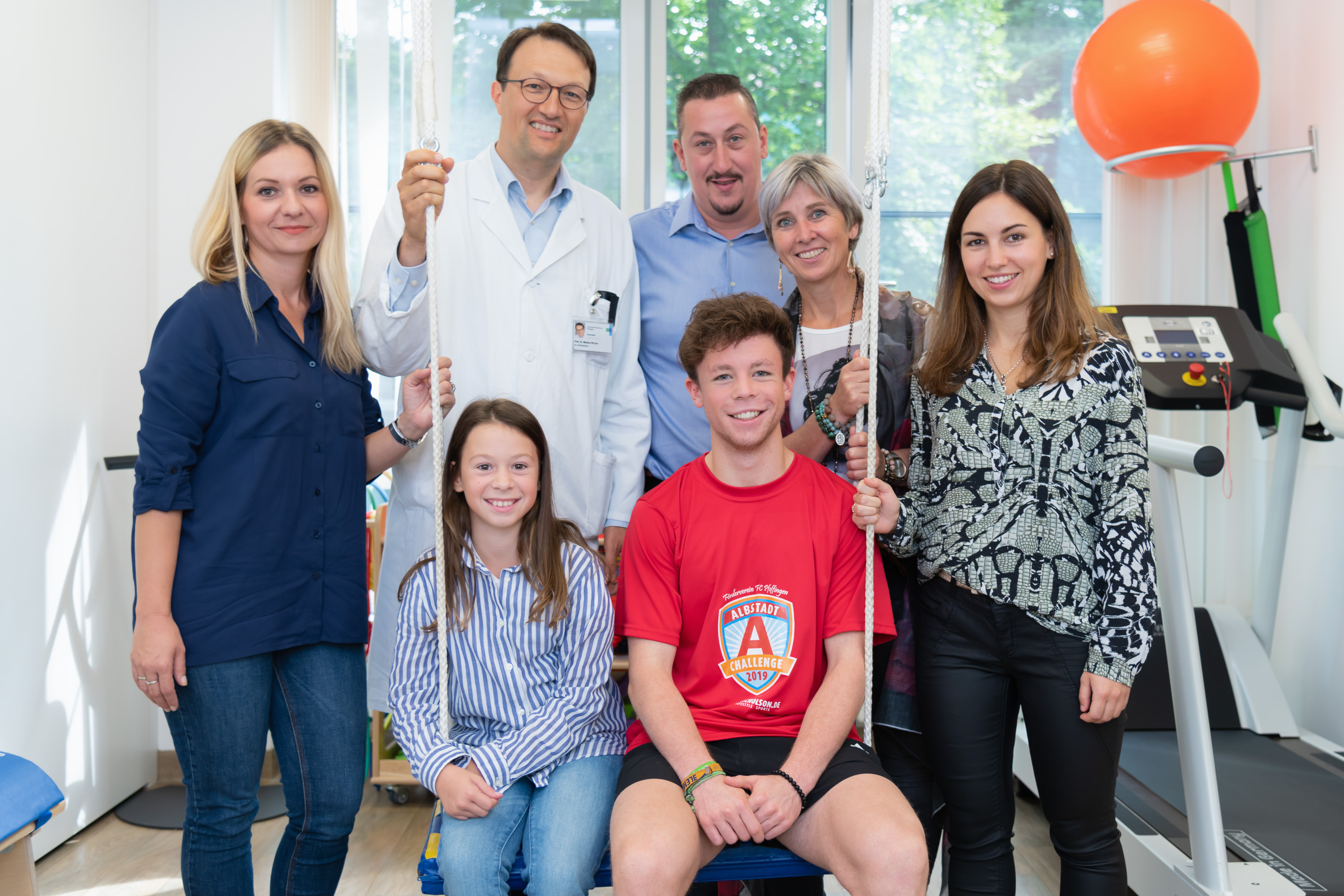 19_KI_CML_presse_04: Gemeinsam gegen CML – die Familien von Lea (12) und Yunus (18, beide auf der Schaukel) unterstützen die Aktion „Klettern für Heilung“ der Kinderonkologie des Uni-Klinikums Erlangen, um auch anderen Kindern und Jugendlichen die Chance auf ein normales Leben zu ermöglichen. V. l.: Lea mit ihren Eltern Dragana und Darko Jankovic, Prof. Dr. Markus Metzler sowie Yunus mit seiner Schwester Ayla und Mutter Dr. Cornelia Borowczak.