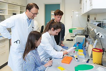 19_KI_PK_CML_16_presse:Im Forschungslabor der Kinderonkologie schauen Lea (12), Yunus (18) und ihr Arzt Prof. Dr. Markus Metzler einer Mitarbeiterin beim Pipettieren über die Schulter. Die durch „Klettern für Heilung“ gesammelten Spenden sollen zu großen Teilen in die onkologische Forschung fließen.