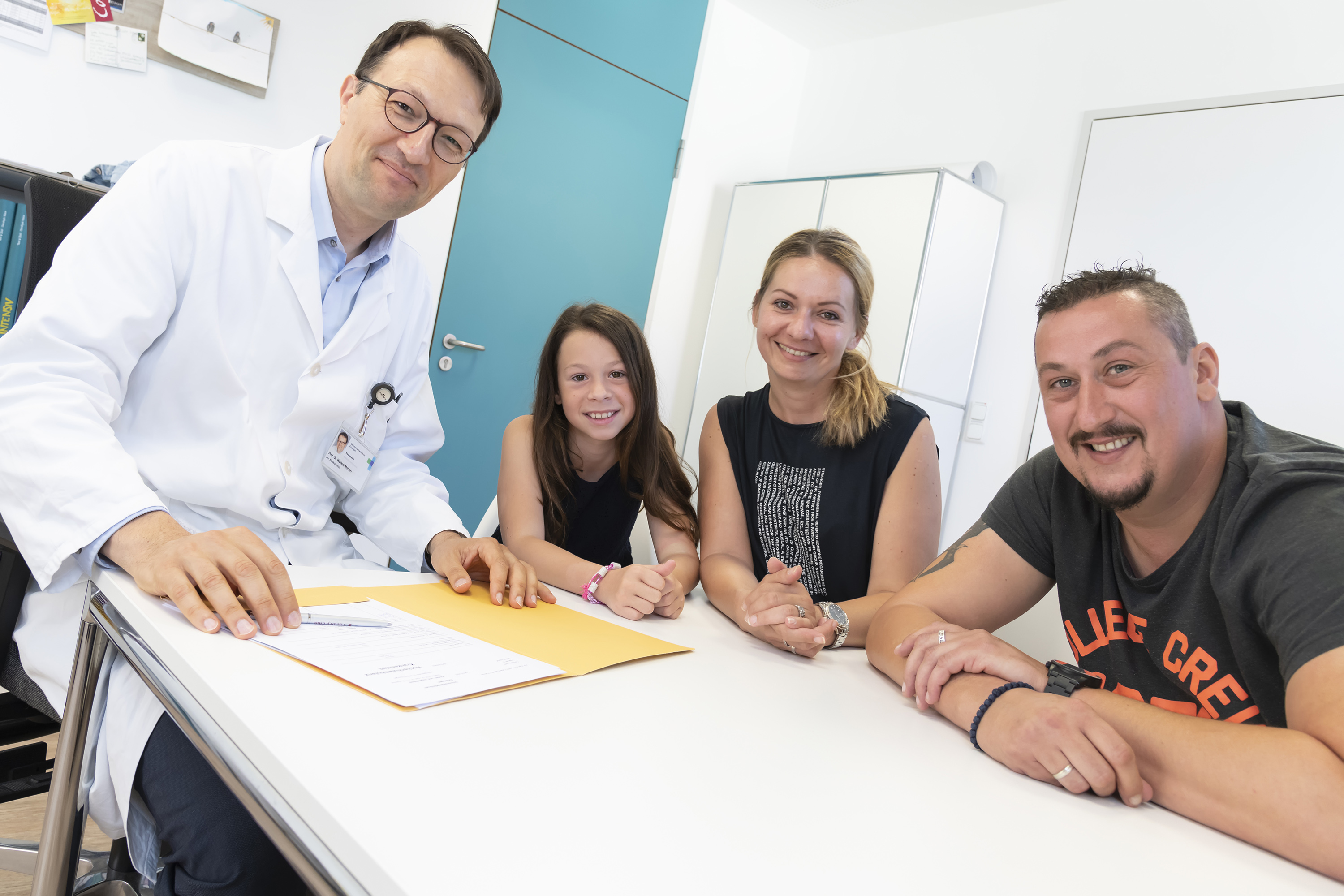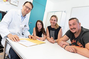 19_KI_CML_presse_01: Prof. Dr. Markus Metzler während eines Nachsorgegesprächs mit Lea und ihren Eltern Dragana und Darko Jankovic.