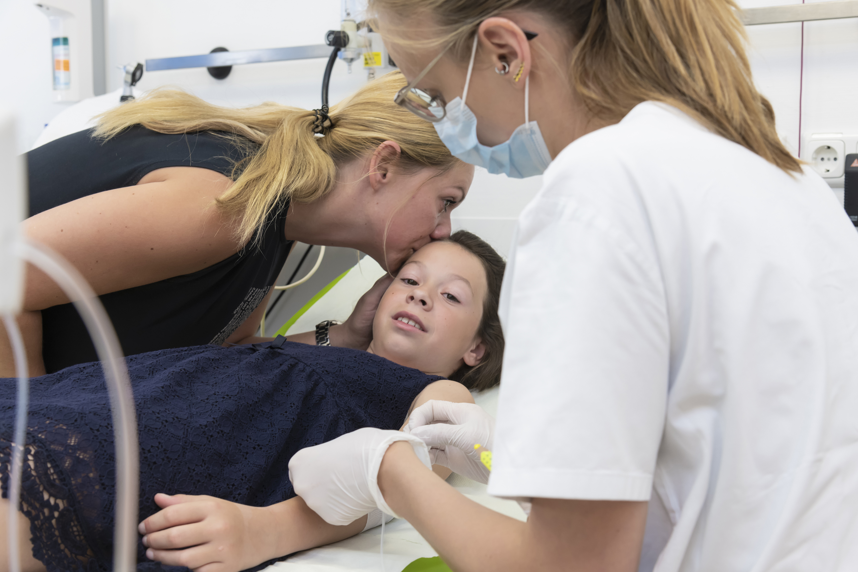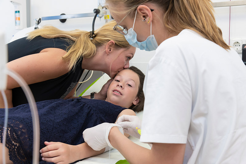 19_KI_CML_presse_02: Lea kurz vor der regelmäßigen Knochenmarkpunktion in der Erlanger Kinderonkologie. Ihre Mutter Dragana Jankovic begleitet sie. Mit molekulargenetischen Methoden wird Leas Knochenmark im Labor untersucht. So stellen die Onkologen fest, ob Leas Körper weiterhin gesundes Blut bildet.