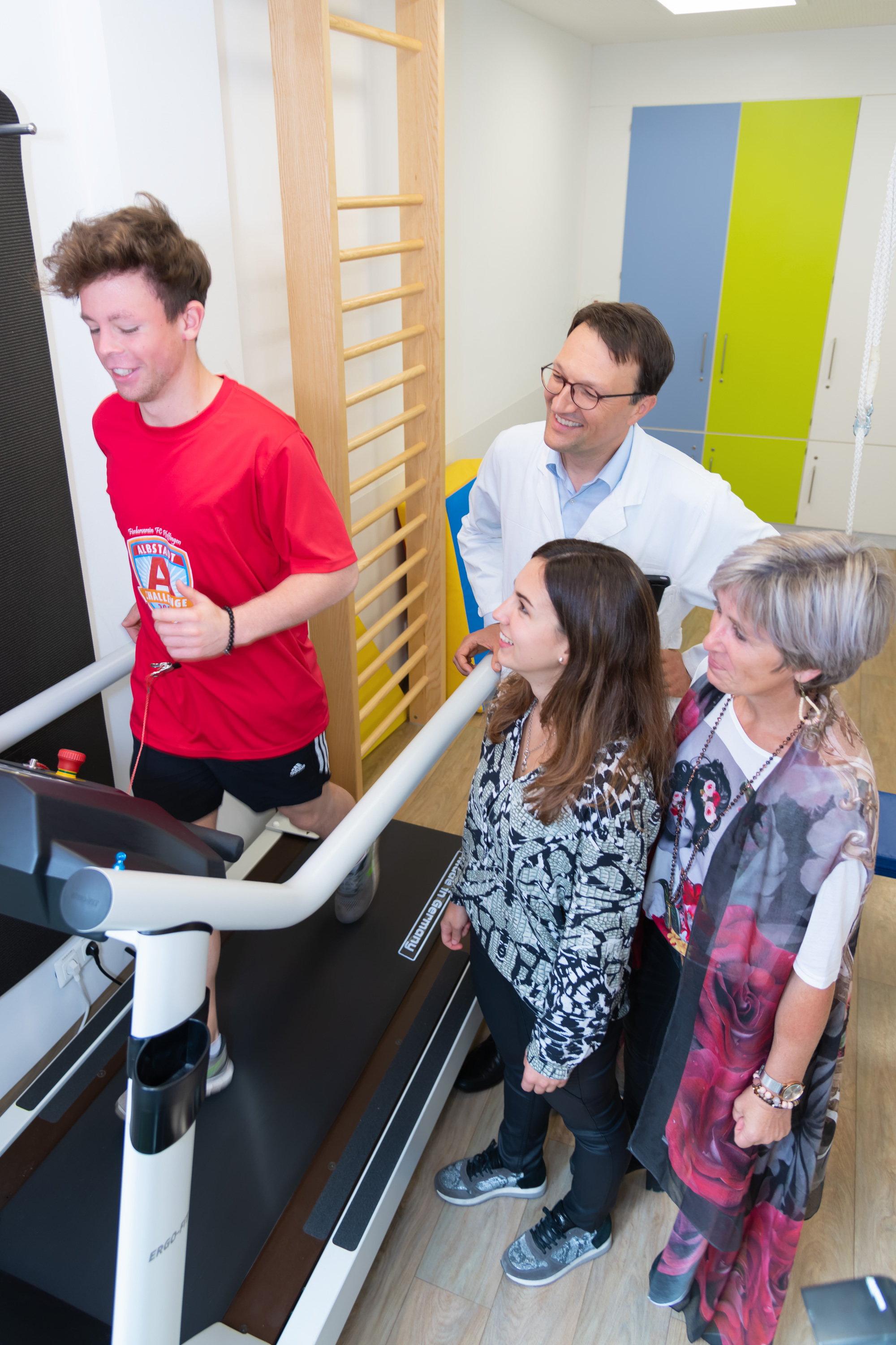 19_KI_CML_presse_03: Der 18-jährige Yunus ist trotz seiner CML-Diagnose vor sechs Jahren fit für den Gipfel, wie er auf dem Laufband beweist. Yunus, seine Mutter Dr. Cornelia Borowczak und seine Schwester Ayla (neben ihm) wollen gemeinsam mit Prof. Dr. Markus Metzler (hinten) den Kilimandscharo erklimmen.