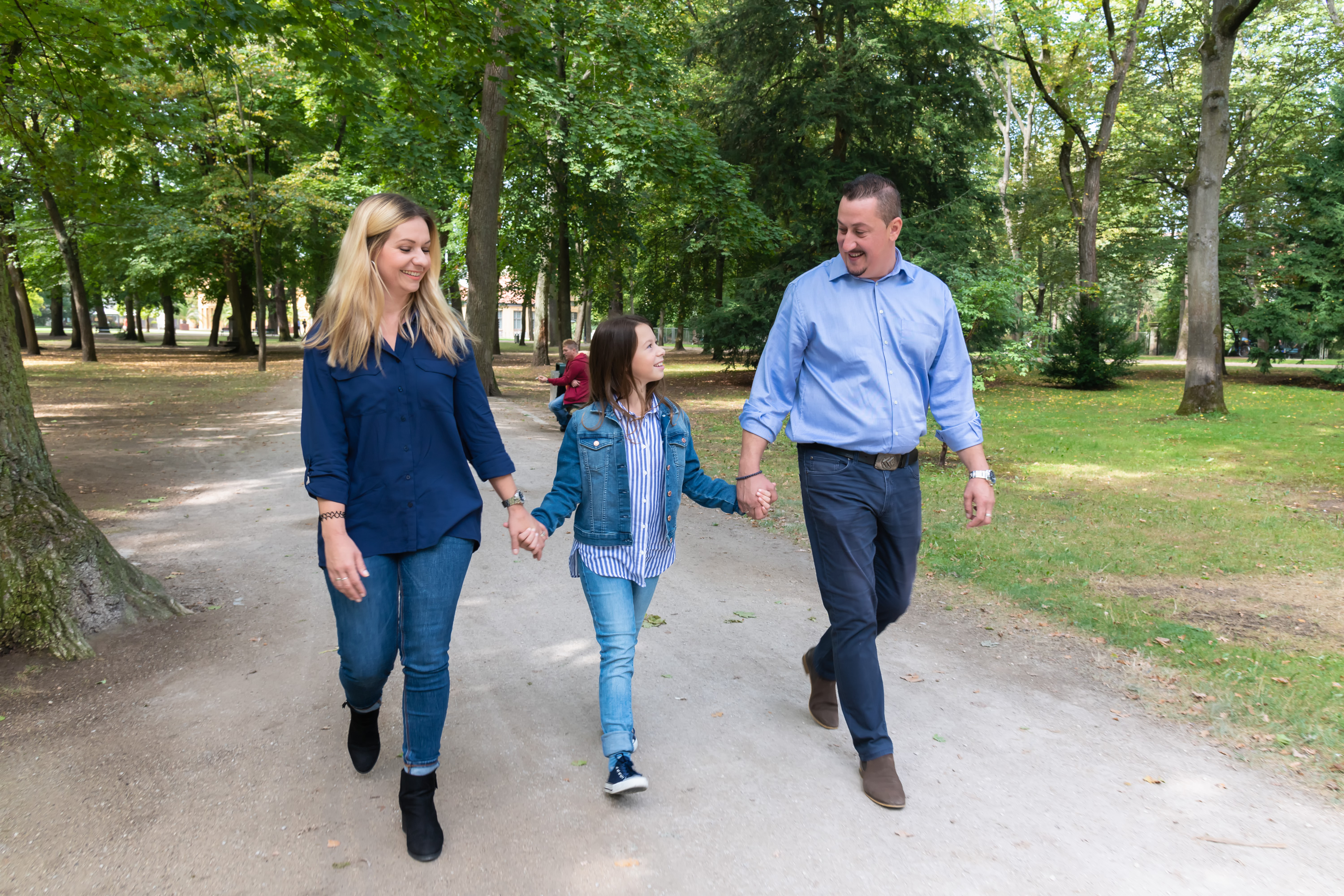 19_KI_PK_CML_30_presse:Lea und ihre Eltern Dragana und Darko Jankovic bei einem Spaziergang durch den Erlanger Schlossgarten. Dass die Familie so unbeschwert sein kann, verdankt sie vor allem der medikamentösen Therapie, die individuell an Lea angepasst wurde.