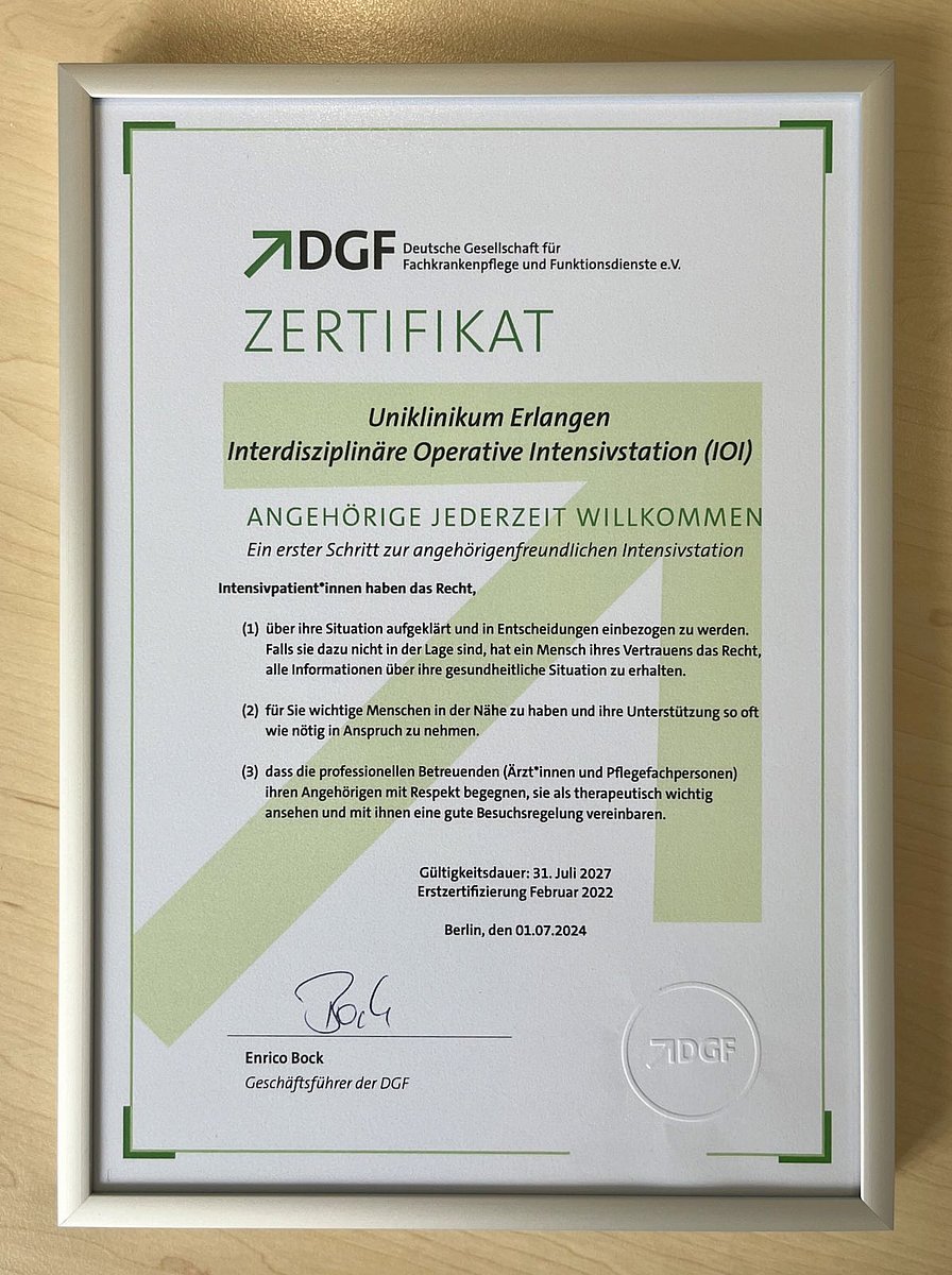 Bereits im Februar 2020 wurde der Anästhesiologischen Intensivstation (IOI) als erste Intensivstation am Uniklinikum Erlangen das Zertifikat „Angehörigenfreundliche Intensivstation“ vom Verein Pflege e.V. ausgestellt. Inzwischen wurde die Erteilung dieses Zertifikates an die Deutsche Gesellschaft für Fachkrankenpflege und Funktionsdienste e. V. weitergegeben (DGF). Die IOI-1, IOI-2 und die IOI-3 konnte nun auch die DGF davon überzeugen, dass der Titel „Angehörigenfreundliche Intensivstation“ weiterhin zu Recht getragen werden darf.