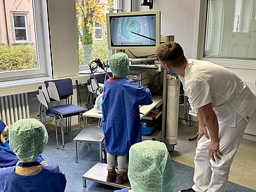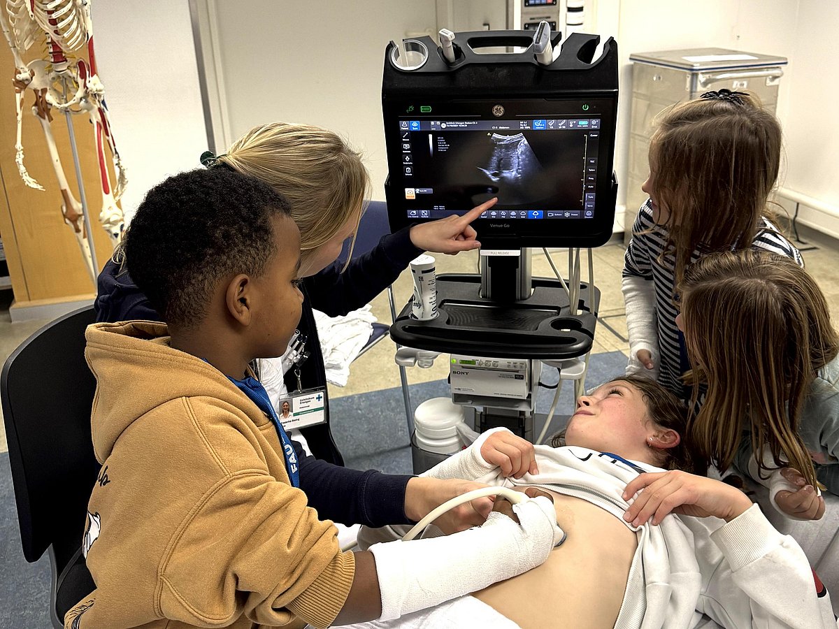 Mit dem Ultraschall den Bauch vom besten Freund untersuchen, Unterarme durch Gipse fachmännisch versorgen oder Maoams beim Laparoskopieren entfernen – das durften 20 Kinder des Kinderhorts Mitte (Leiter: Sebastian Bleier) jetzt in der Kinderchirurgischen Abteilung des Uniklinikums Erlangen (Leiter: Prof. Dr. Manuel Besendörfer) im Rahmen der diesjährigen Kinderuni. Als feste Institution bietet die FAU in den Herbstferien Grundschülern der Region den Einblick in verschiedene Fachdisziplinen, um das Interesse der kleinen Forscherinnen und Forscher zu wecken.