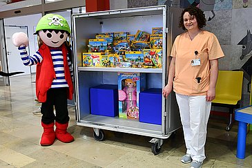 KreBeKi und die Stiftung Kinderförderung von PLAYMOBIL ermöglichten den Besuch des kuscheligen Fernsehstars und übergaben Spielesets an die Kinderklinik