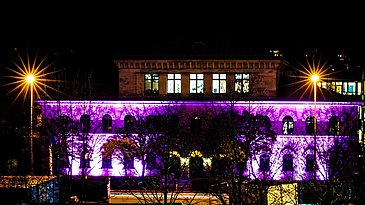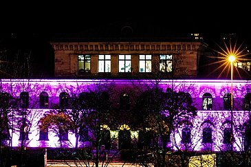 Unter dem Motto "Die Welt sieht LILA" wurden Donnerstagnacht (16.11.2017) weltweit Gebäude lila angestrahlt, so auch die Kaufmännische Direktion des Universitätsklinikums Erlangen am Maximiliansplatz. "Wir wollten damit auf den Bauchspeicheldrüsenkrebs aufmerksam machen, der zu den aggressivsten Krebserkrankungen gehört", sagte der Direktor der Chirurgischen Klinik, Prof. Dr. Robert Grützmann. Jährlich erkranken allein in Deutschland etwa 16.700 Menschen am Pankreaskarzinom.