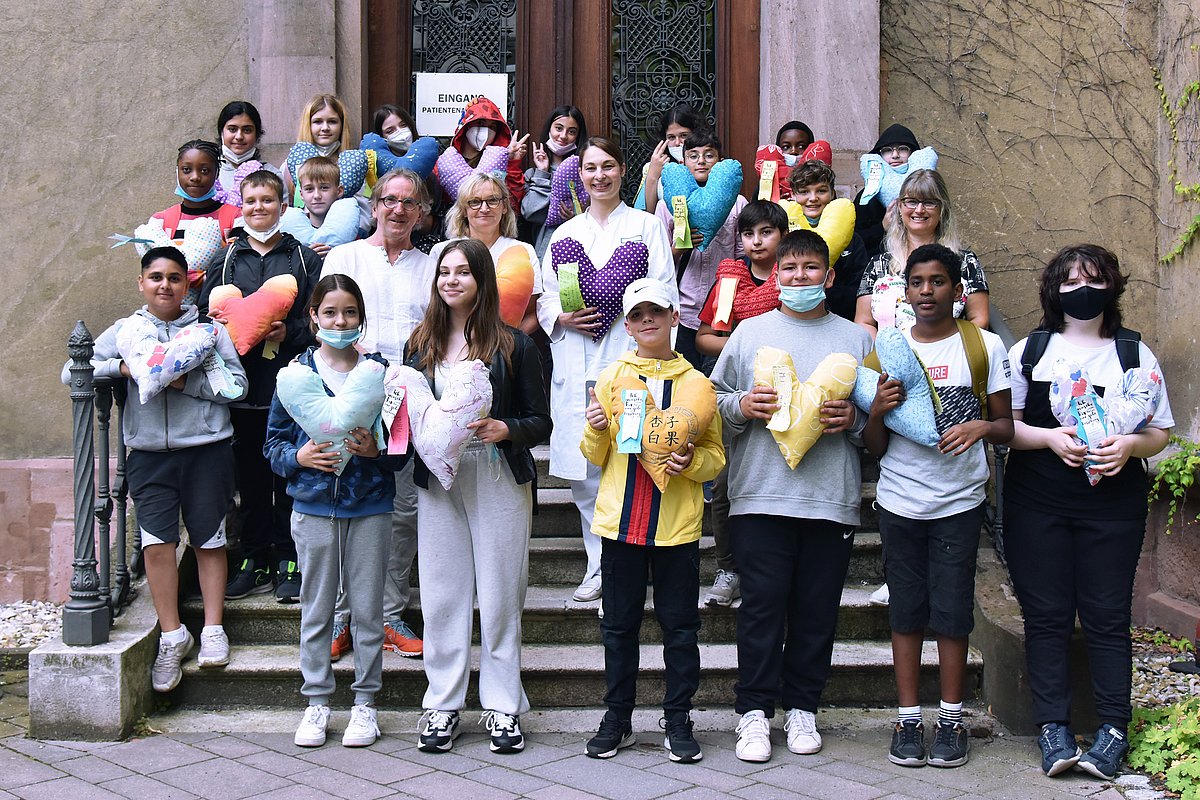 Schülerinnen und Schüler aus Nürnberg spenden 120 selbst genähte Herzkissen an die Erlanger Frauenklinik