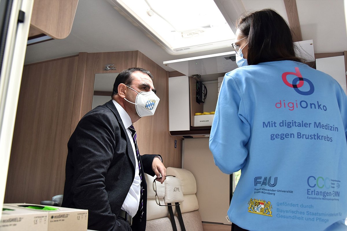 Am Donnerstag, 29. September 2022, besuchte Klaus Holetschek, Bayerns Staatsminister für Gesundheit und Pflege, die Frauenklinik (Direktor: Prof. Dr. Matthias W. Beckmann) des Uniklinikums Erlangen, um sich über den aktuellen Stand des Projekts „digiOnko“ zu informieren. „digiOnko“ möchte mithilfe der Digitalisierung Brustkrebs besser vorbeugen und behandeln. Die Verantwortlichen haben nun verschiedene Bestandteile wie das Gesundheitscenter für zu Hause, das Präventionsmobil sowie die begleitende Studie inklusive Health-App vorgestellt.
