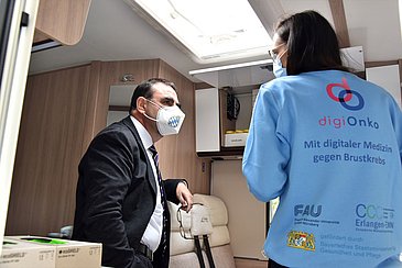 Im Rahmen von „digiOnko“ wurde ein Bus so ausgestattet, dass er als Präventionsmobil sowohl einen Raum für Informationsgespräche als auch einen Laborbereich zur Verarbeitung von Bioproben bietet. Besucherinnen haben die Möglichkeit, innovative genomische und molekulare Tests in Anspruch zu nehmen, die Hinweise auf die Entstehung von Krebserkrankungen geben können. Das „digiOnko“-Mobil kann in räumlicher Nähe zu Mammografiescreening-Bussen, aber auch unabhängig davon an verschiedenen anderen Standorten zum Einsatz kommen. Ab Mitte Oktober 2022 wird der Bus in ganz Nordostbayern unterwegs sein.