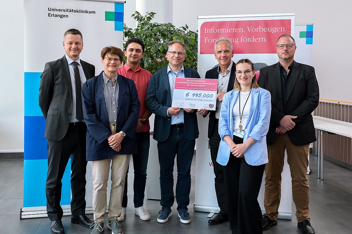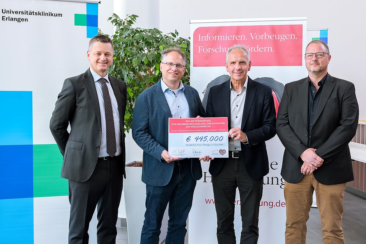 „Wir sind der Deutschen Herzstiftung und vor allem auch den Spendenden Gisela und Herbert Fälschle sehr dankbar für die großzügige finanzielle Unterstützung“, sagte Prof. Engel bei der Scheckübergabe. „Dadurch erhalten wir die Möglichkeit, unsere Forschungsarbeiten im Bereich des 3-D-Drucks von Herzgewebe erheblich zu intensivieren und schneller Fortschritte zu erzielen.“ Die Deutsche Herzstiftung widmet sich der Förderung von Forschungsprojekten im Bereich der Herz-Kreislauf-Erkrankungen. Geschäftsführer Martin Vestweber: „Wir sind stolz darauf, Projekte wie den 3-D-Herzdruck unterstützen zu können, die einen echten Unterschied im Leben von Patientinnen und Patienten machen können.“ Die Fördersumme von 445.000 Euro stammt aus dem Nachlass der Eheleute Gisela und Herbert Fälschle, die beide am Uniklinikum Erlangen in Behandlung waren und nun posthum ihre Dankbarkeit zum Ausdruck bringen möchten, verdeutlichte ihr Neffe Stefan Winderlich, der den Nachlass verwaltet.