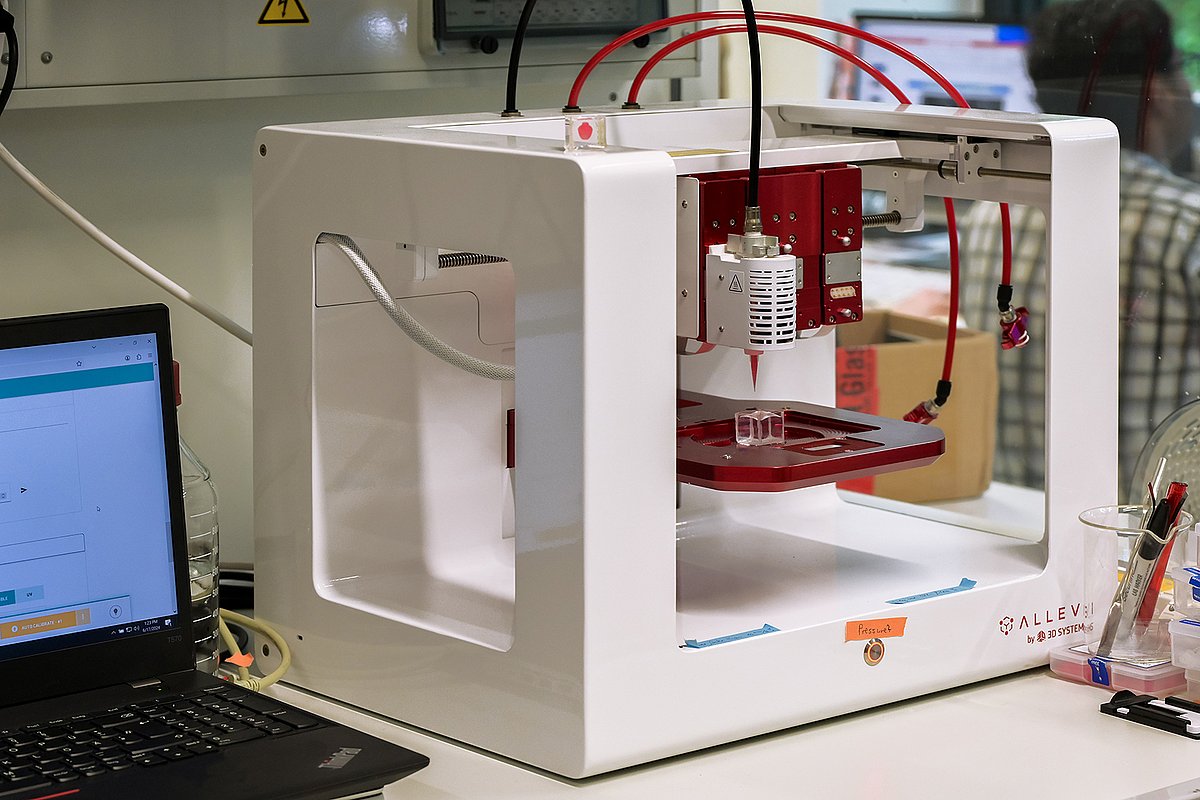 Die Wartelisten für eine Organtransplantation übertreffen die Anzahl der tatsächlich gespendeten Organe um ein Vielfaches. Angesichts dieses Missverhältnisses verfolgen Medizinerinnen und Mediziner seit Jahrzehnten die Idee, individuell angepasste menschliche Organe wie Niere, Leber und Herz künstlich herzustellen. Diese Vision nimmt dank wegweisender Fortschritte in der Zellproduktion, der Stammzellforschung und dem Bioprinting nun immer mehr Gestalt an. „Bioprinting ist ein 3-D-Druckverfahren, bei dem wir Biotinte einsetzen, um menschliches Gewebe zu erzeugen“, erklärt Prof. Engel. „Das direkte Drucken lebender Zellen hatte sich anfangs als sehr schwierig erwiesen, beispielsweise weil die Biotinte sehr flüssig ist. Inzwischen haben wir eine Methode entwickelt, bei dem der Druck in ein spezielles Stützbad erfolgt.“ Das aus Mikropartikeln bestehende Stützbad hält die Form der gedruckten Tinte, bevor diese mit der Zeit von selbst aushärtet. Anschließend wird das gedruckte Gewebe extrahiert und in einem 37 Grad warmen Inkubator über mehrere Tage kultiviert. Durch das Stützbad ist keine Form nötig, in die die Biotinte gegossen werden muss. Vielmehr lässt sich der Druck Schicht für Schicht aufbauen, wodurch die Forschenden freier in ihrer Arbeit sind.