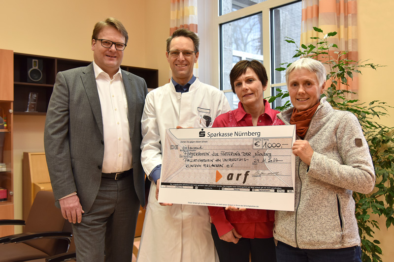 An das Lebensende denkt man nicht gerne. Trotzdem stehen Krankheit, Tod und Trauer mitten in der Gesellschaft und jeder wird sich einmal damit auseinandersetzen müssen. Jetzt spendete die arf Gesellschaft für Organisationsentwicklung mbH 1.000 Euro an die Palliativmedizinische Abteilung (Leiter: Prof. Dr. Christoph Ostgathe) des Universitätsklinikums Erlangen. Der Hintergrund: Gutes tun und Aufmerksamkeit für ein Thema wecken, das nicht verdrängt werden darf.