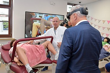 Bei der Eröffnungsveranstaltung veranschaulichten verschiedene Stationen im Simulationskreißsaal Situationen aus dem Berufsalltag einer Hebamme. Studierende der Hebammenwissenschaft demonstrierten anhand von Modellen die Untersuchung einer Schwangeren, den Umgang mit einem Neugeborenen sowie die wichtigsten Handgriffe bei der Betreuung einer Wöchnerin. Dank einer Augmented-Reality-Brille, die virtuelle Inhalte über dem Sichtfeld der Nutzerin oder des Nutzers und in der realen Welt einblendet, hatten die Anwesenden außerdem die Möglichkeit, in den Körper einer Gebärenden zu sehen und so die Position und Bewegung des Kindes in der Gebärmutter und im Becken während des gesamten Geburtsverlaufs zu verfolgen.