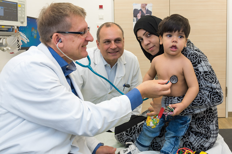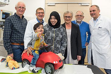 Dass etwas mit ihrem Kind nicht stimmt, war Athraa Alsowaijt schon kurz nach dessen Geburt im März 2016 klar. Das Gesicht ihres kleinen Jungen verfärbte sich immer wieder blau. Zehn Tage und einige Arztbesuche später diagnostizierte ein Kardiologe in der südirakischen Stadt Basra einen komplexen Herzfehler. "Da brach für uns eine Welt zusammen", erinnert sich die 28-Jährige. "Weder können wir das Geld für die erforderlichen Operationen aufbringen, noch gibt es in unserer Heimat Experten mit der nötigen Erfahrung und der technischen Ausstattung." Über Vertrauenspersonen wurde der Fall zunächst an Dr. Eva-Maria Hobiger und ihr Hilfsprojekt "Aladins Wunderlampe" herangetragen, die sich schnell mit Dr. Hildegard Müller-Erhard, Vorstandsvorsitzende von Erlangen hilft e. V., in Verbindung setzte. Den zwei Frauen war klar: "Kayan braucht unsere Hilfe. Wir können ihm die Chance auf ein normales Leben verschaffen." Tatkräftig unterstützt werden sie dabei von Dr. Faidi Omar Mahmoud, einem ehemaligen Herzchirurgen mit syrischen Wurzeln, der Mutter und Kind kontinuierlich begleitet, beispielsweise zu den Untersuchungen am Uni-Klinikum Erlangen, und für sie dolmetscht.
