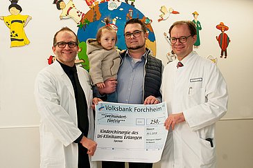 So mancher Start ins Leben verläuft etwas holprig - so wie bei der kleinen Lia aus dem oberfränkischen Hausen. Noch im Mutterleib fanden Ärzte mehrere Zysten in ihrer Lunge. In der Kinderchirurgischen Abteilung (Kommissarischer Leiter: Prof. Dr. Robert Grützmann) des Universitätsklinikums Erlangen wurde das kleine Mädchen jedoch erfolgreich operiert und ist heute gesund. Zum Dank für die sehr gute Versorgung spendete Lias Vater Markus Wagner jetzt 250 Euro, die der leitende Kinderchirurg Dr. Manuel Besendörfer entgegennahm. Das Geld soll bedürftige Eltern unterstützen, deren Kinder stationär betreut werden müssen.