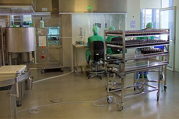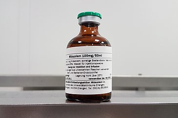 Ziel der Aktion ist es, insgesamt 100.000 Flaschen Injektions-/Infusionslösung Midazolam herzustellen. Mitte Juni war dieses Vorhaben bereits zur Hälfte erreicht. „Da der Wirkstoff länger haltbar ist als das zubereitete Medikament, belassen wir es zunächst dabei und halten die andere Hälfte als Reserve für eine eventuelle zweite Welle im Herbst zurück“, erläutert Ralph Heimke-Brinck. „Bei uns am Uni-Klinikum Erlangen haben sechs Mitarbeiter innerhalb von fünf Tagen 7.000 Flaschen hergestellt. Produziert wurde in unseren Reinräumen nach dem international für die Arzneimittelherstellung gültigen Standard ‚Good Manufacturing Practice‘, kurz GMP. Da wir den Wirkstoff bereits vor einigen Jahren für unser eigenes Uni-Klinikum verarbeitet haben, konnten wir jetzt auf diese Erfahrungen zurückgreifen.“ Die 7.000 Einheiten Midazolam lagern nun in der Apotheke des Uni-Klinikums Erlangen und können von Apotheken anderer Krankenhäuser bei Bedarf bestellt werden.