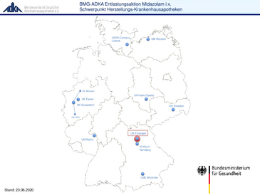 Ein Fernsehbeitrag über die einmalige BMG-ADKA-Entlastungsaktion Midazolam i. v. wird am Dienstag, 21. Juli 2020, zwischen 21.45 und 22.15 Uhr im ARD-Magazin „FAKT“ ausgestrahlt. Gedreht wurde auch in der Apotheke des Universitätsklinikums Erlangen.