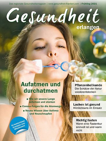 Befreit durchatmen – das ist in Pandemiezeiten nicht immer leicht. Im März widmet sich „Gesundheit erlangen“, herausgegeben vom Universitätsklinikum Erlangen, der Lungengesundheit und fragt: Wie können wir unser Atmungsorgan stärken? Was sind die größten Risikofaktoren für unsere Lunge? Was gibt es Neues bei der Behandlung von Heuschnupfen und Asthma, und welche langfristigen Folgen hat das Coronavirus? Der Lungenfacharzt PD Dr. Florian Fuchs und die Allergieexpertin Dr. Nicola Wagner vom Uni-Klinikum Erlangen geben Antworten. So erfahren die Leser u. a., warum die „Kuhstallpille“ gegen Heuschnupfen wirkt, wie es sich mit der 4711-Methode entspannter atmet und warum Sportler nach einer Corona-Infektion nur langsam wieder mit dem Training beginnen sollten.