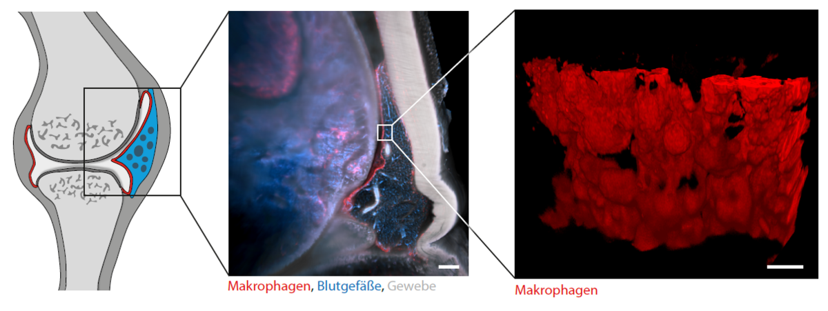 So zeigte sich unter anderem, dass gesunde Gelenke durch eine sich ständig selbsterneuernde Membran aus speziellen Immunzellen (Makrophagen) ummantelt werden. Während diese Barriere aus Makrophagen unsere Gelenke im Regelfall vor möglichen Attacken des eigenen Immunsystems schützt, versagt bei rheumatoider Arthritis dieser Schutzmechanismus. Hierdurch wandern plötzlich fehlerhaft aktivierte Immunzellen ein, welche letztlich die Gelenksentzündung und -zerstörung verursachen. Während Makrophagen bisher im Verdacht standen, zur Gelenksentzündung beizutragen, zeigen die aktuellen Analysen, dass sie eigentlich einen wichtigen anti-entzündlichen Schutzmantel um das Gelenk bilden und Entzündungsreaktionen eindämmen können.