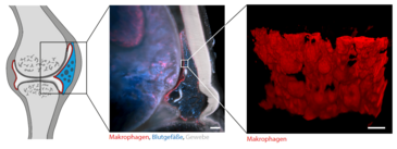 (rot = Makrophagen, blau = Blutgefäße, grau = Gewebemorphologie, Größenbalken 200µm und 10µm) Quelle: Dr. Anika Grüneboom/Uni-Klinikum Erlangen