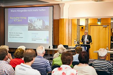 "Hilfe bei Schwerhörigkeit" - unter diesem Leitspruch informierten die Veranstalter des 1. Bayreuther Hörtags im ARVENA KONGRESS Hotel in Fachvorträgen und Erfahrungsberichten Betroffene, Angehörige und Interessierte über die Chancen einer Versorgung mit CI oder Hörgerät. Sie ermöglichten zudem den Austausch mit anderen Betroffenen. "Viele unter Schwerhörigkeit leidende Menschen wissen nicht, welche medizinischen Möglichkeiten ihnen zur Verfügung stehen, die sowohl das Hörvermögen als auch das Sprachverstehen verbessern und damit auch die Lebensqualität steigern können", erläuterte Professor Dr. Dr. Ulrich Hoppe, Leiter des CICERO. Für Professor Dr. Dr. Heinrich Iro, Direktor der HNO-Klinik in Erlangen, ist es eine essentielle Aufgabe seiner Klinik, Fachwissen umfassend weiterzugeben: "Natürlich ist es am Ende nicht die Technik, sondern der Patient, der hier Behandlungswege vorgibt. Wir können ihm die Hilfestellung anbieten, sich im Austausch mit Ärzten und anderen Betroffenen zu informieren und herauszufinden, welche Behandlungsmethode für ihn infrage kommen könnte." Die Chance, fundiert mehr über die Versorgungsmethode CI zu erfahren, nahmen in Bayreuth über 80 Menschen wahr. In einem HÖRMobil des Deutschen Schwerhörigenbundes e.V. (DSB) konnten vor Ort direkt orientierende Hörprüfungen durchgeführt werden.